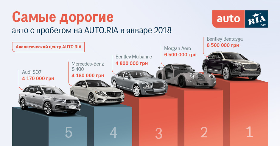 Если же говорить о самых дорогих авто, то в январе пальма первенства среди авто с пробегом принадлежит Bentley Bentayga — за него новый владелец заплатил чуть больше 8,5 млн грн. А общая цена пяти самых дорогих январских авто с пробегом составила чуть меньше 30 млн грн.