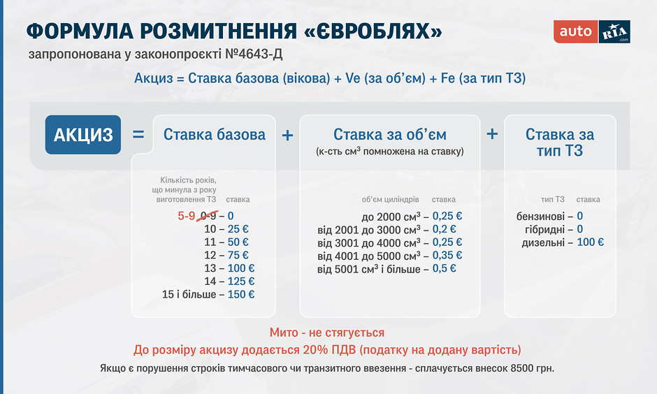 Формула начисления акциза, ставки, и уникальный принцип расчета налога на добавленную стоимость остались такими же, как и в редакции проектов к первому чтению. Изменилась лишь первая графа в «базовой ставке», где вместо «0-9» стало «5-9» лет (напомним, речь идет о возрасте авто).