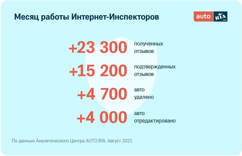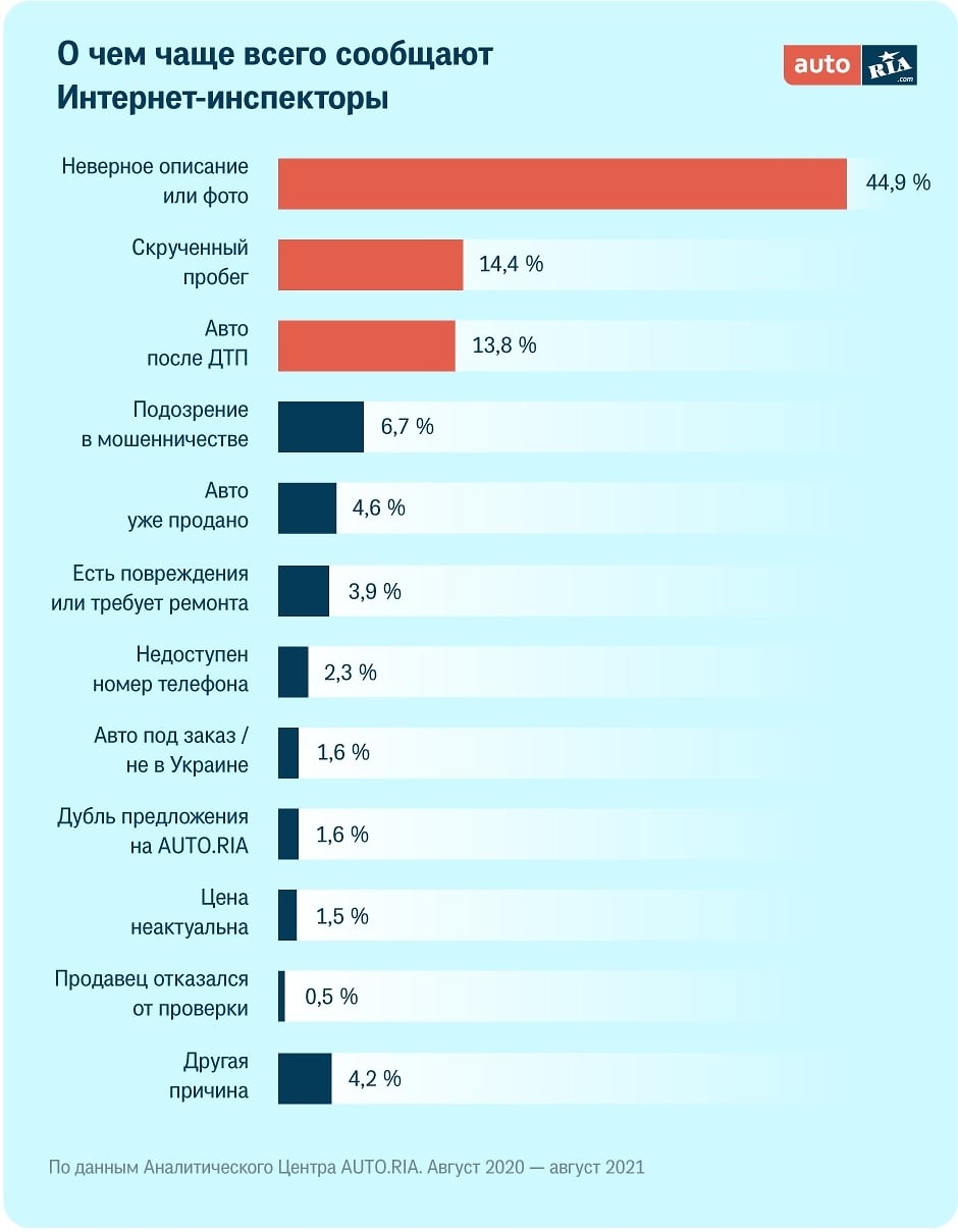 В течение года к сообществу Интернет-Инспекторов (автолюбителей, приславших хоть один отзыв) присоединилось 117 000 человек, что сопоставимо с населением целого города Ужгорода. Чаще всего Интернет-Инспекторы жалуются на недостоверное описание или фото авто. Также большая доля жалоб касается скрученного пробега. Между прочим, по данным AUTO.RIA в I квартале 2020 года доля авто с разногласиями пробега составляла 39%, а уже через год, в I квартале 2021-го — 27%. На третьем месте по популярности сокрытие ДТП или его деталей.