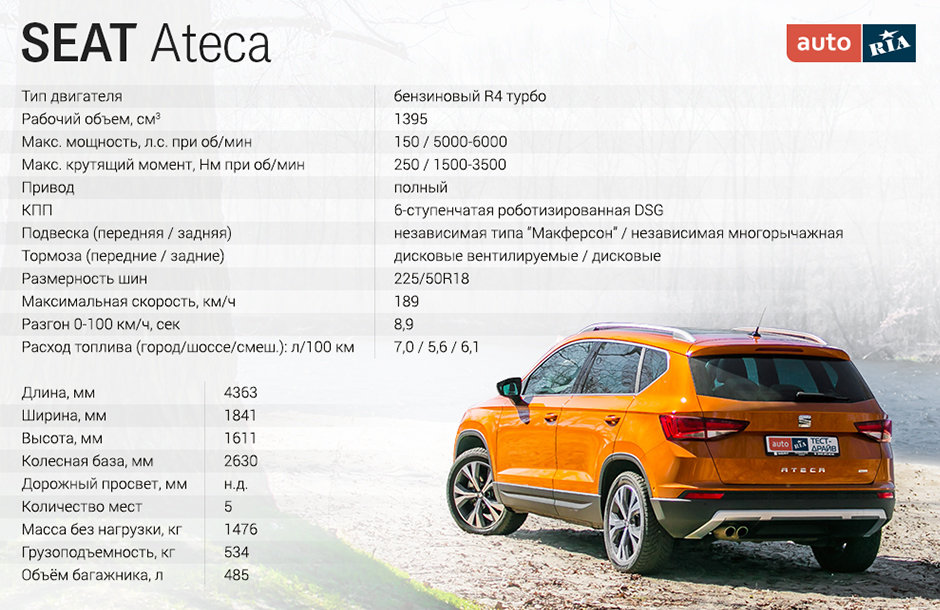 SEAT Ateca – это нео-классический кроссовер С-класса, по размерам он вполне сравним с бестселлером Nissan Qashqai. Под стать чину и технологии: переднеприводным модификациям суждено довольствоваться Макферсоном спереди и скручиваемой балкой сзади, в то время как автомобили с колесной формулой 4х4 получают муфту Haldex 5 поколения и заднюю многорычажку. Именно такая наша оранжевая Ateca с 1,4-литровым бензиновым турбомотором и 6-ступенчатой роботизированной КПП. Кстати, еще одно преимущество полноприводных машин — повышенный на целый сантиметр дорожный просвет.