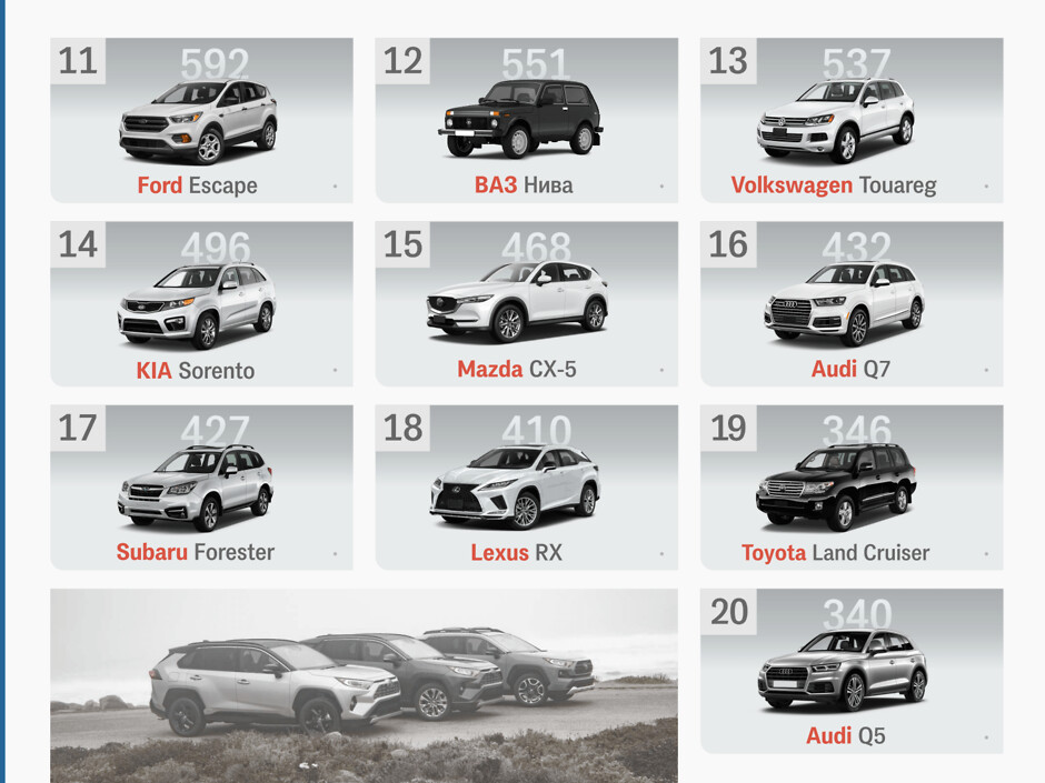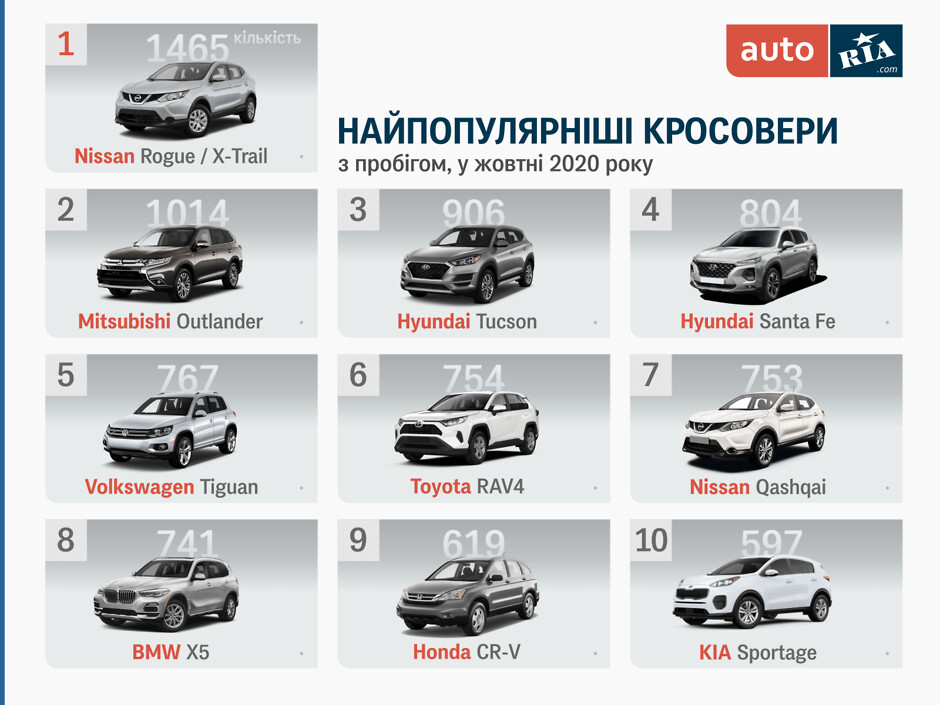 Объемы торгов и первых регистраций легковых авто на украинском авторынке в октябре достигли 121 тысячи сделок, что является вторым результатом в году (больше было в июле - 130 тыс.). Таким образом сегмент кроссоверов и внедорожников занял 19,5% от общих объемов вторичного рынка (24 тыс. авто). Какие модели были самыми популярными?