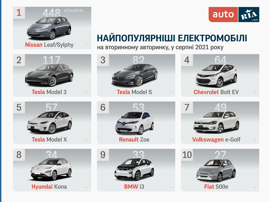 Если же рассмотреть более точные числа по итогам августа, обработав открытые данные ГСЦ МВД о регистрационных действиях с транспортными средствами получаем общий объем «вторички» в 1195 «электричек», из которых 584 были «свежепригнанными». В списке самых популярных авто на электротяге заметных изменений не произошло, разве что незначительный обмен позициями нескольких моделей.