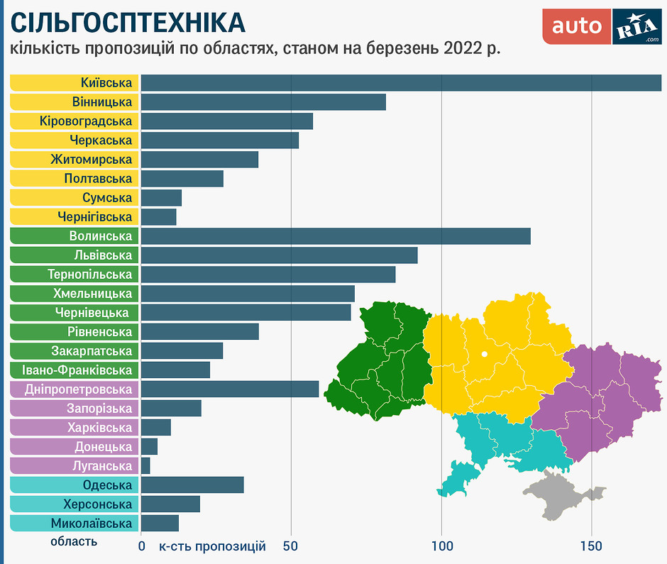 Ми визначили, який зараз стан справ з пропозицією про продаж с/г машин та устаткування у всіх підконтрольних Україні регіонах, щоб тим, хто займається фермерською справою, було простіше орієнтуватися на ринку. Ось як виглядає пропозиція по всій Україні: