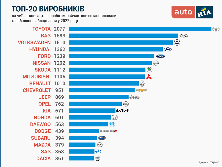 Тепер час розглянути цей сегмент авторинку детальніше: спершу про марки автомобілів, на яких найчастіше з’являлося ГБО у 2022 році. Лідером з переобладнань стала Toyota, завдяки тому, що цей виробник не надто поспішає переводити двигуни своїх авто на пряме впорскування бензину й додавати до цього турбонаддув. Щодо ВАЗ – їх просто ще залишається певна кількість в автопарку, й для таких застарілих інженерних рішень, які аж ніяк не відрізняються економним споживанням бензину, ГБО мало не єдиний шлях хоч якось внормувати експлуатаційні витрати. Зрештою, ось слайд з двадцятьма марками та кількістю авто, які отримали ГБО торік: