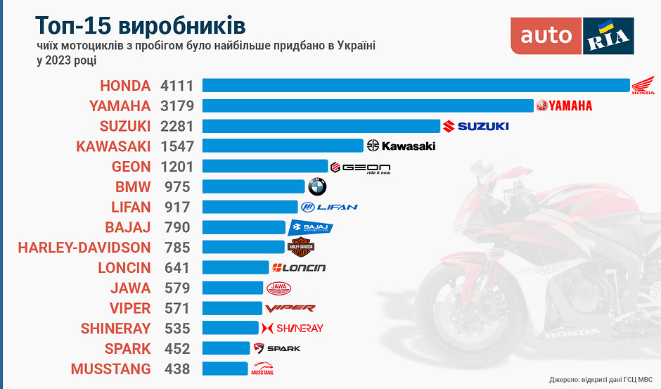 З виробників найчастіше українські байкери обирали японську продукцію – Honda, Yamaha та Suzuki. Ці три марки охоплюють 40% обсягів усього вторинного ринку мотоциклів в Україні.