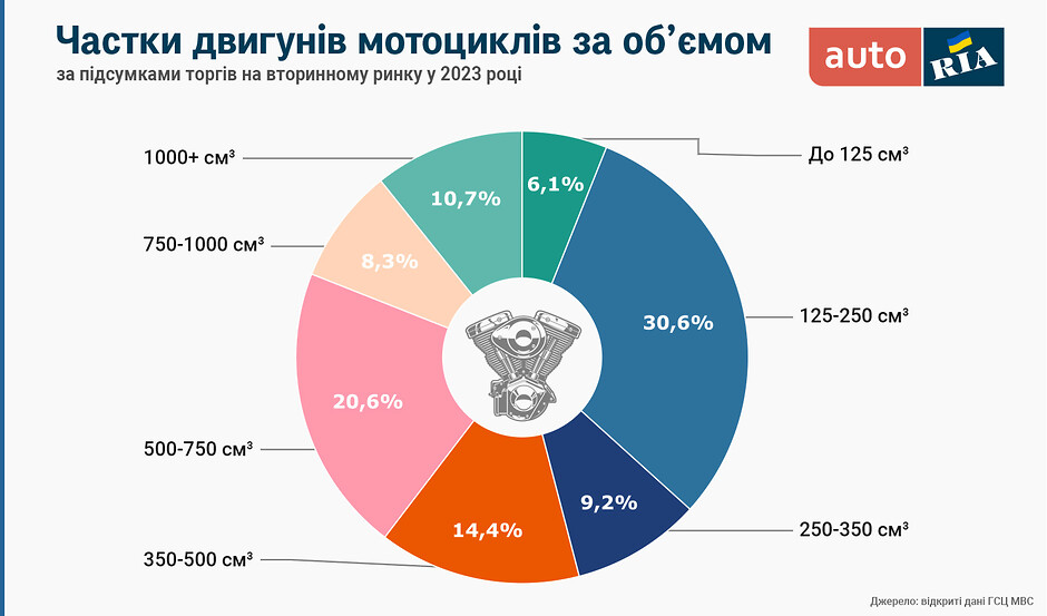 За робочим об’ємом двигуна наймасовішою стала група 125-250 см3, зайнявши майже третину ринку. Другі за популярністю – досить потужні варіанти з двигунами від 500 до 750 см3. Також до трійки лідерів за «кубатурою» увійшли мотоцикли з робочим об’ємом циліндрів 350-500 см3.