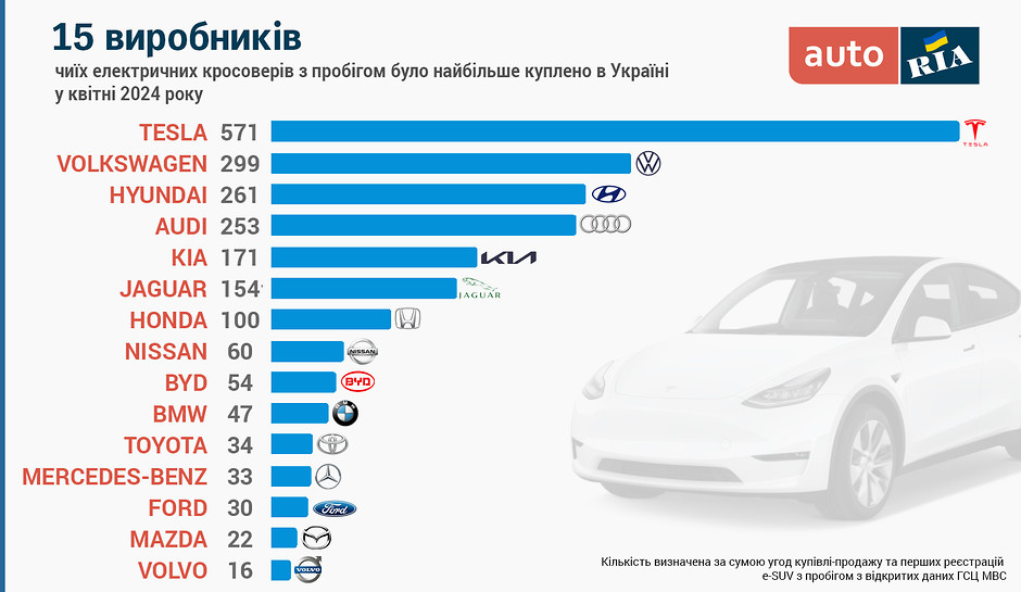 Почнемо з марок. Впевнена першість тут за Tesla, завдяки кросоверу, побудованому на базі «трійки» Model Y (який у нас хто лиш як не називає – від «модел у» чи «модел уай» до просто «тесла-ігрек»). На другому місці серед виробників e-SUV з пробігом Volkswagen, переважно через популярність ID.4 Crozz. Третє місце за підсумками першого місяця вести дісталося Hyundai – серед «електричок» цієї корейської марки у групі кросоверів лідирує Kona.