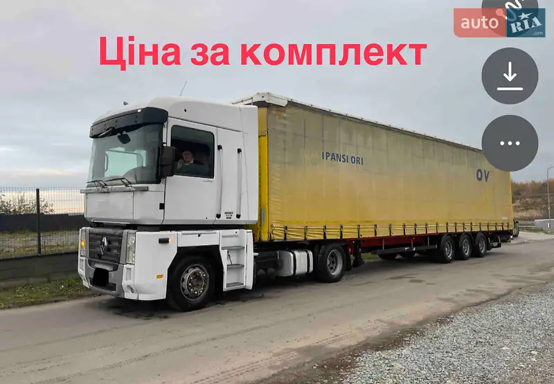 Опис Ціна за комплект, Renault Magnum 460 DXI, причіп schwarzmuller 2008 року, в чудовому стані, дах новий, роліки нові, шини 70% залишок, по авто замінені всі гальмівні диски і колодки, ролики, ремні , масла, фільтра , шини руль ведучка нові. Авто в чудовому стані іздила Украіна - Європа, всі має сертифікати, салон трансформер . Вся інформація по телефону.
