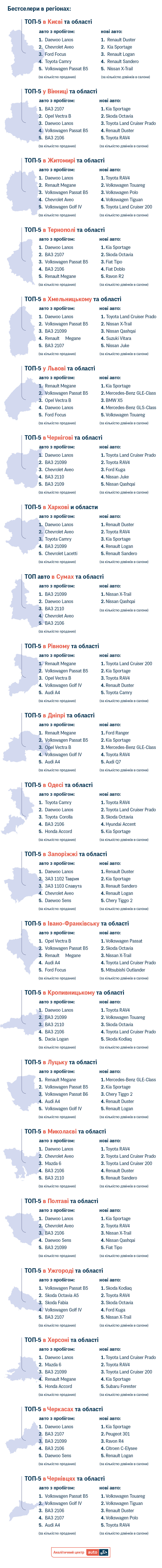 Що стосується нових авто, то тут лідер теж незмінний. Як і рік тому, найчастіше у салонах запитують Kia Sportage. Хоча в регіонах картина може відрізнятись, що зумовлено наявністю в області автосалонів та представлених у них брендів. Так, наприклад, мешканці Київській області здійснили найбільше дзвінків (37,11% від загального числа), а найпопулярнішим у салонах столичного регіону виявився Renault Duster.