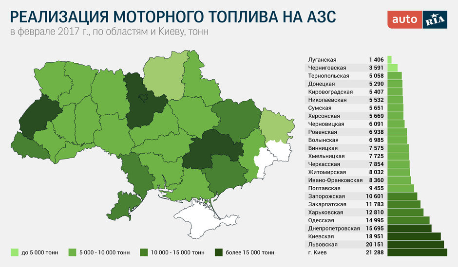Це питання — скоріш екологіче, і цікаве воно насамперед тим, хто вибирає населений пункт з найчистішим (точніше, найменш забрудненим) повітрям. Оскільки більшість великих підприємств давно простоює, а їхні димові труби заросли павутинням, в багатьох регіонах, де немає теплоелектростанцій, автотранспорт створює істотну частку забруднення атмосферного повітря. Тож, вибираючи, наприклад, квартиру або будинок для життя на чистому повітрі серед перевірених пропозицій на DOM.RIA, звертайте увагу на Чернігівську, Тернопільську, Кіровоградську або близькі до них за кількісними показниками реалізації палива регіони. Зрозуміло, що все відносно – кожна з областей має різне населення та площу, - як і ринок праці або потенціал для ведення бізнесу. Антилідером з екології традиційно є місто Київ, Львівська область, а на третьому місці — Київська область. Далі – від Дніпропетровської до Житомирської обл. плавне зниження кількості тонн реалізованого пального.