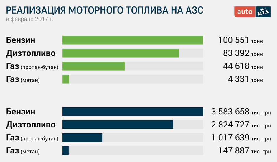 Незважаючи на загальне прагнення до економії (хоча б на етапі покупки автомобіля) і значний парк комерційного транспорту, солярку для якого купують також на звичайних автозаправках, лідирує все ж бензин. Дизпаливо на другому місці, а LPG, як називають зріджену пропан-бутанову суміш, на третьому. Автогаз купують у кількості удвічі меншій за тоннажем, хоча по літражу розрив буде не настільки значним. Природний стиснений газ на основі метану з усіх видів палива користується найменшим попитом. Причина – висока вартість та значна вага обладнання, мала кількість АГНКС, необхідність в спеціальних дозволах для закачування газу в транспортний засіб і вартість кубометра метану, яка відчутно збільшилась за останній час.