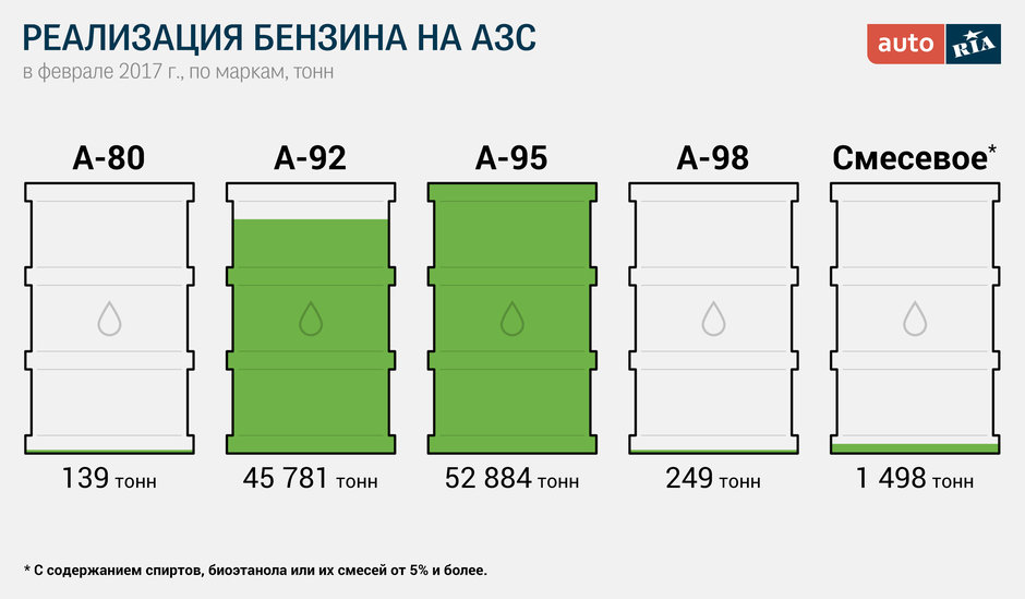 Багато хто вже встиг забути про «сімдесят шостий»: цей бензин вже кілька років в Україні не використовується. Втім, незабаром може зникнути і бензин вісімдесятої марки – в деяких областях, згідно з статистичними даними, його не продавали зовсім. А-92 і А-95 користуються найбільшим попитом, а ось високооктановий сорт марки А-98, хоч він і вдвічі популярнішим 80-го, в порівнянні з лідируючими сортами продається незначними об'ємами. Більше того, – біопаливо розкуповували активніше, ніж «дев'яносто восьмий». Виходить, двох сортів бензину цілком достатньо, - а якщо взяти до уваги що часто ціна на них майже однакова (якщо товар без додатків «плюс», «супер», «євро» і т. п.), то варіант обійтись усім світом одним «регулярним» 95-м не виглядає цілком нереальним.