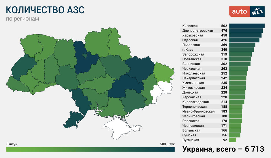 Автомобілісти так давно забули про слово «дефіцит», що обираючи АЗС часто враховують не наявність або вартість пального, а керуються питанням де кращий смак кави і закусок. Так тому, що в Україні вже є 6713 АЗС, включно з газовими та газокомпресорними заправками. Хочете знати, як вони розподілені по областях?