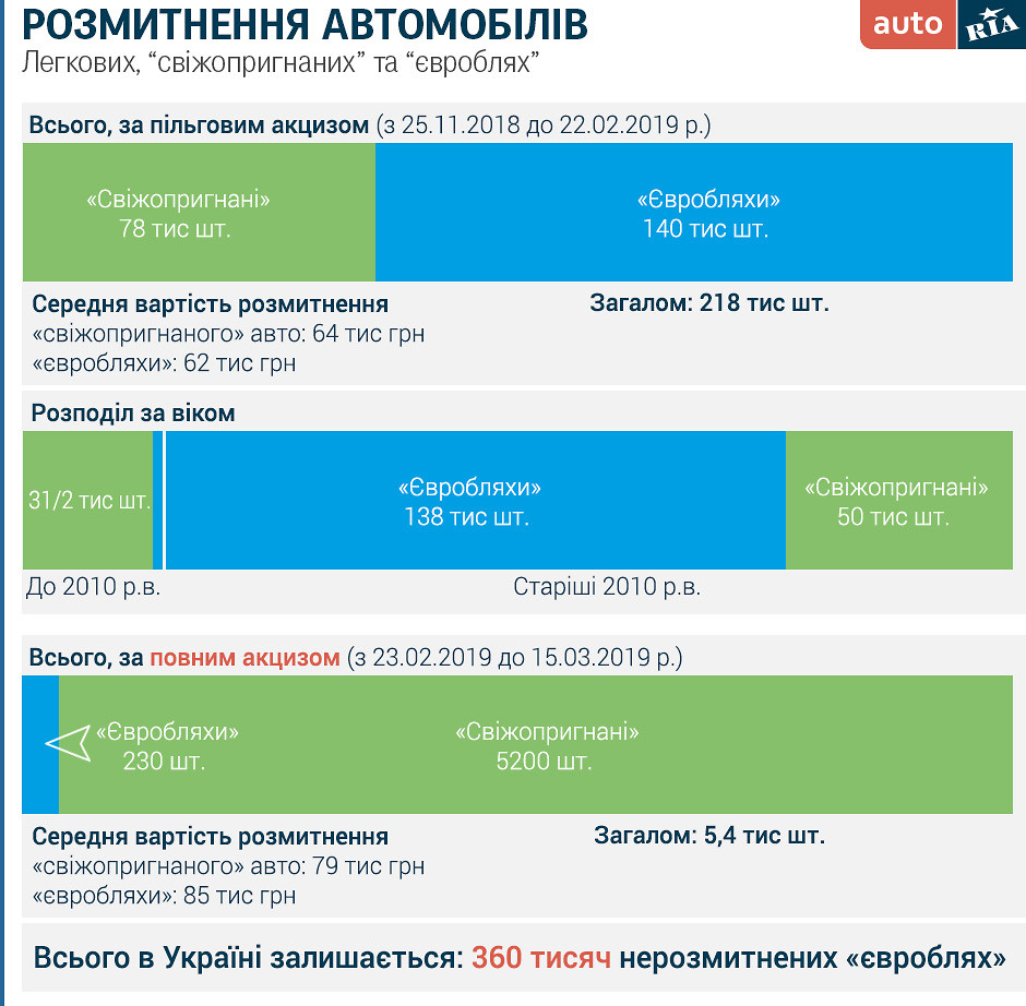 Поки діяла разова 50% знижка на акциз, процедуру митного оформлення пройшли 218 тисяч легкових автомобілів. З них раніше перебували на території України в режимі «транзит» чи «тимчасове ввезення» - це так звані «євробляхи» - 140 тисяч. Багатенько, адже за минулі 2 роки було розмитнено менше авто, ніж за ці 3 місяці з пільгами.