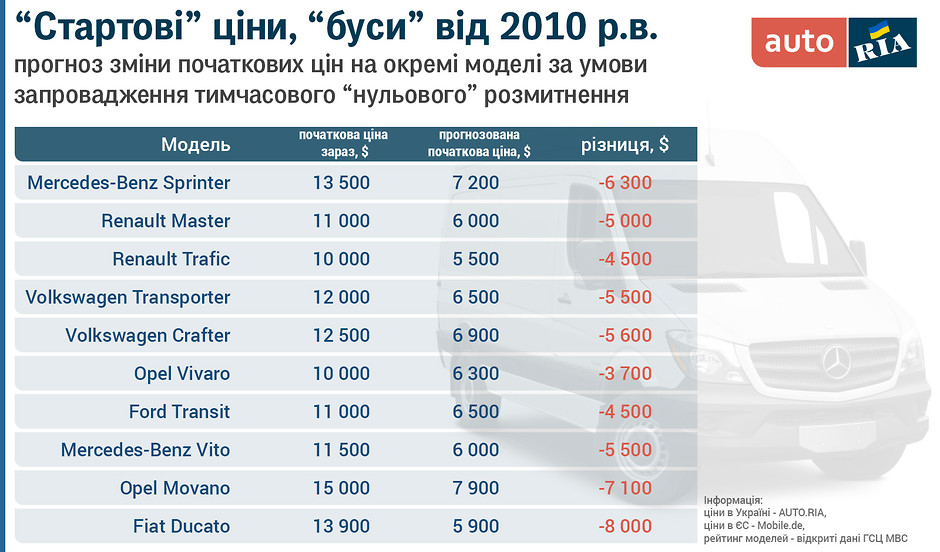 Саме тому для наступних розрахунків ми візьмемо популярні в Україні вантажні «буси», у діапазоні 2010-2014 р.в., дізнаємося їхні «стартові» ціни (відкинувши найдешевші авто, не на ходу, з видимими не усуненими пошкодженнями тощо) з каталогів AUTO.RIA, далі отримаємо такі ж дані з оголошень, які розміщені на європейських сайтах з продажу авто. Додамо до отриманих цін «там» витрати на доставлення, сертифікацію, збір до Пенсійного фонду та вартість послуг сервісних центрів МВС, й поглянемо, на яку потенційну різницю можна очікувати.