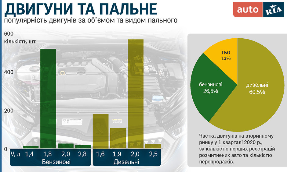 На слайд потрапили майже усі мотори, крім найбільшого бензинового об’ємом 3,6_л. Такий на вторинному ринку протягом першого кварталу «проскочив» лише раз. Часом авто з цим мотором трапляються у продажу, але вкрай рідко. Його потужність 260 «коней» і встановлювався він на повноприводного «Суперба».