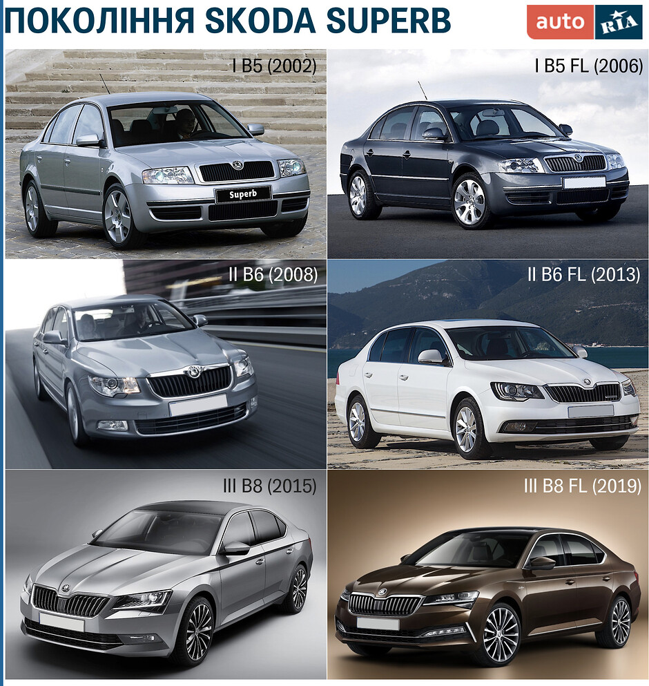 Є три покоління Skoda Superb, кожне з яких мало оновлення. Різниця між випусками 2002 та 2006 на фото не надто помітна, - хіба незначні зміни передньої решітки та бампера. Значно більше змін тоді відбулося всередині: машина отримала нову панель приладів та доповнену моторну гамму. У наступних генераціях зовнішні зміни значно виразніші.