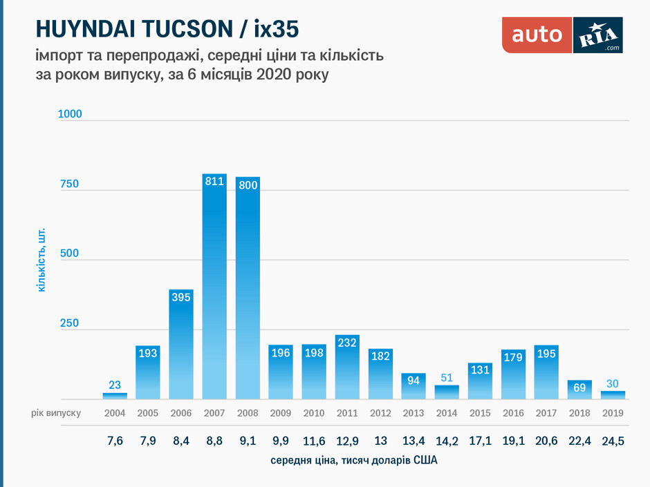 Загалом за перше півріччя 2020-го року в Україні було продано 923 нових Hyundai Tucson, укладено 2480 договорів купівлі-продажу для вживаних, та 1300 «Туксонів» з пробігом було імпортовано.
