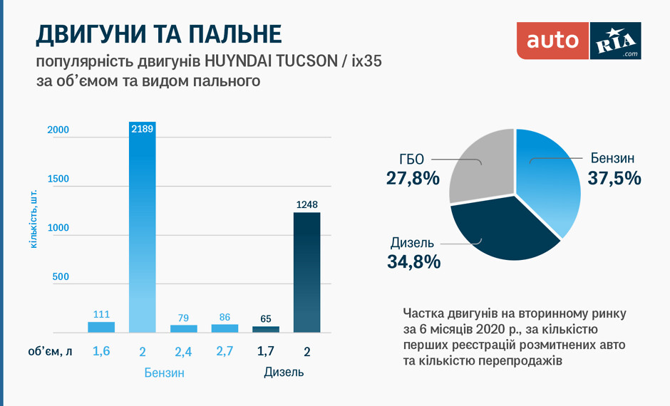 Hyundai Tucson на вторинному ринку переважно пропонується з бензиновими двигунами (де 37,5% «чисто» бензинові, 27,8% з ГБО, разом 65,3%), дизельних версій – 34,8%. Гібриди, які з’явились у 2016 році, на нашому авторинку «проскакують» вкрай рідко.