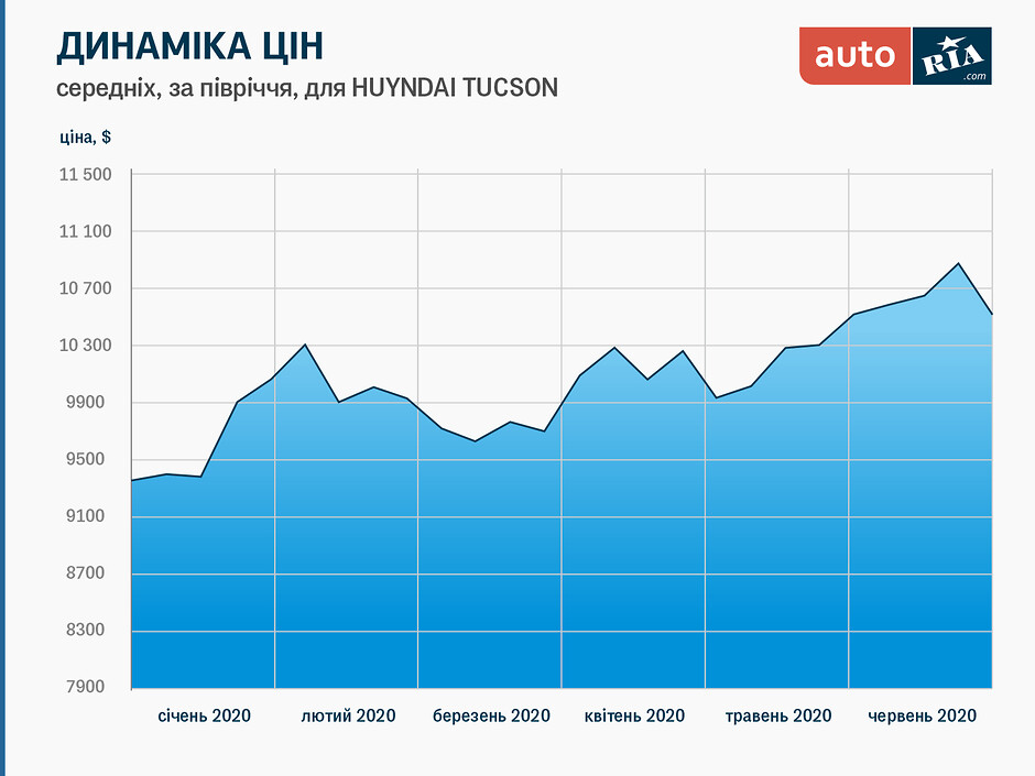 Якщо перевірити за допомогою нашого сервісу підрахунку середніх цін їхню динаміку для різних поколінь «Туксона», можна побачити, що перша і найпопулярніша наразі генерація взагалі не піддавалась жодним зовнішнім чинникам – лінія на діаграмі виходить майже горизонтальна. Версії після 2010 року випуску повільно дорожчали, і ледь помітне зниження лінії можна спостерігати хіба на найновіших випусках цієї машини.