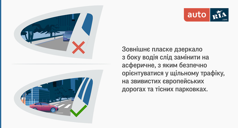 Що варто зробити. Замінити дзеркальний елемент на асферичний, з яким водій зможе оглядати значно більше простору, що значно безпечніше при перестроюванні, паркуванні, руху заднім ходом. Звісно, після заміни слід пам’ятати, що «Objects in mirror are closer they then appear» - об’єкти у дзеркалі насправді значно ближче, ніж це здається.
